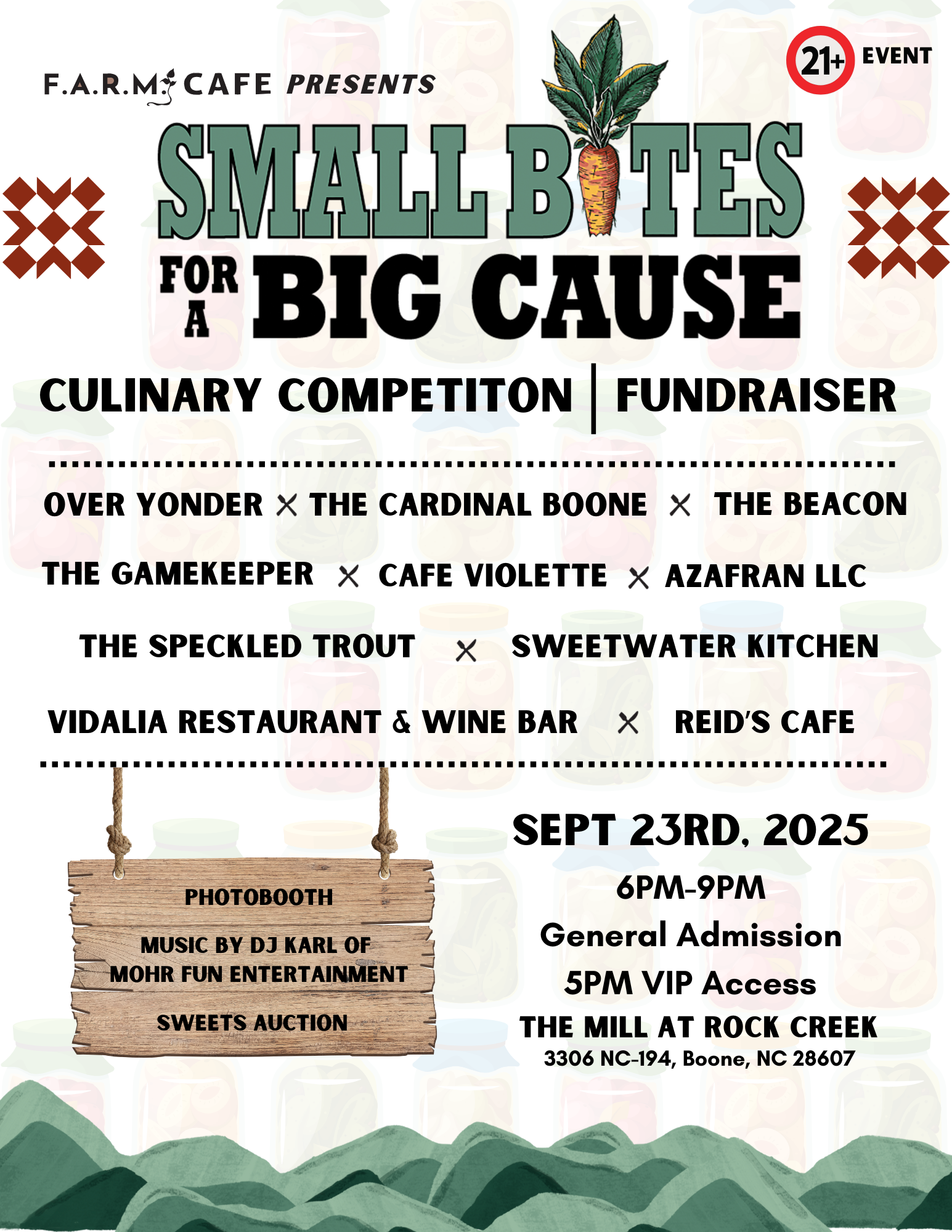 'Small Bites for a Big Cause' is a friendly fundraising culinary competition showcasing High Country Grown chefs. They will be challenged to incorporate fresh, local ingredients into bite-sized hors d'oeuvres. Ticket holders will have the chance to taste each small bite and vote on their favorites.